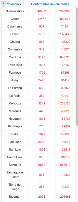 El total de acumulados por distrito indica que la provincia de Buenos Aires suma 2.999.998 casos; la Ciudad de Buenos Aires, 869.071; Catamarca, 74.344; Chaco, 145.439; Chubut, 103.822; Corrientes, 115.074; Córdoba, 848.723; Entre Ríos, 176.168; Formosa, 87.296; Jujuy, 91.417; La Pampa, 90.462; La Rioja, 40.142; Mendoza, 238.128; Misiones, 45.321; Neuquén, 151.727; Río Negro, 129.837; Salta, 143.838; San Juan, 124.241; San Luis, 122.848; Santa Cruz, 81.319; Santa Fe, 656.610; Santiago del Estero, 119.831; Tierra del Fuego, 403.33 y Tucumán, 296.663.