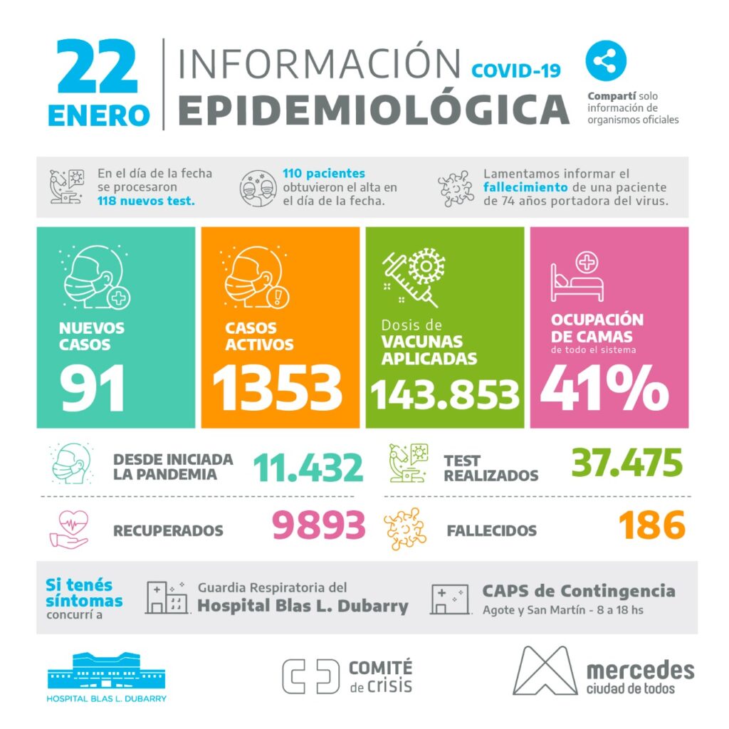 Con la información brindada este sábado son 1353 los casos activos. En Mercedes son 186 las personas fallecidas por el virus desde que la pandemia arribó a la ciudad y 11432 personas los que transitaron la enfermedad.