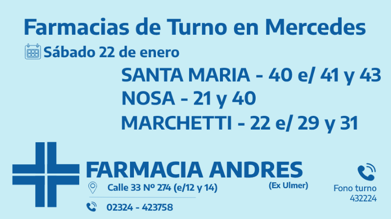Farmacias de turno del sábado 22 de enero 22 enero, 2022Desde las 8:30 del día de hoy hasta la misma hora de nalabam las farmacias de turno en Mercedes son: Santa María y Nosa.Comparte esto: Haz clic para compartir en WhatsApp (Se abre en una ventana nueva) WhatsApp Haz clic para compartir en Telegram (Se abre en una ventana nueva) Telegram Haz clic para compartir en X (Se abre en una ventana nueva) X Haz clic para compartir en Facebook (Se abre en una ventana nueva) Facebook TE PUEDE INTERESARCOMENTARIOS Comentarios