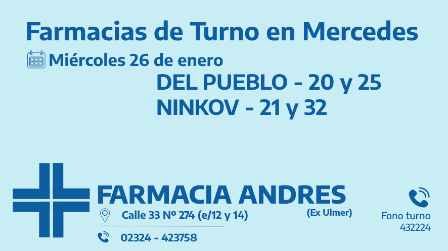 Farmacias de turno del miércoles 26 de enero 26 enero, 2022Desde las 8:30 del día de hoy hasta la misma hora de mañana, las farmacias de turno en Mercedes son: Del Pueblo y Ninkov.Comparte esto: Haz clic para compartir en WhatsApp (Se abre en una ventana nueva) WhatsApp Haz clic para compartir en Telegram (Se abre en una ventana nueva) Telegram Haz clic para compartir en X (Se abre en una ventana nueva) X Haz clic para compartir en Facebook (Se abre en una ventana nueva) Facebook TE PUEDE INTERESARCOMENTARIOS Comentarios