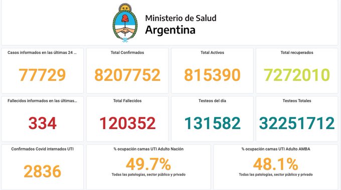 El Ministerio de Salud de la Nación informó este jueves que se registraron 77.729 nuevos contagios de coronavirus y 334 fallecimientos. Argentina alcanza los 120.352 decesos. Los contagios, en tanto, suman 8.207.752.