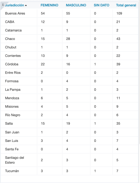 También fallecieron 157 mujeres: 54 en Buenos Aires, 12 en la Ciudad de Buenos Aires, una en Catamarca, 15 en Chaco, una en Chubut, 13 en Corrientes, 22 en Córdoba, dos en Entre Ríos, una en La Pampa, seis en Mendoza, cuatro en Misiones, dos en Río Negro, 15 en Salta, una en San Juan, tres en San Luis, dos en Santiago del Estero, y tres en Tucumán. En tanto, una persona fallecida en Córdoba, una en Salta, y una en Tucumán fueron reportadas sin dato de sexo.