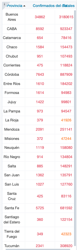 El total de acumulados por distrito indica para la provincia de Buenos Aires 3.180.615 casos; la Ciudad de Buenos Aires, 923.347; Catamarca, 78.416; Chaco, 154.473; Chubut, 107.493; Corrientes, 118.824; Córdoba, 887.909; Entre Ríos, 184.202; Formosa, 94.983; Jujuy, 99.801; La Pampa, 94.547; La Rioja, 41.926; Mendoza, 251.141; Misiones, 47.244; Neuquén, 158.080; Río Negro, 134.804; Salta, 148.291; San Juan, 135.791; San Luis, 127.760; Santa Cruz, 83.116; Santa Fe, 681.592; Santiago del Estero, 122.154; Tierra del Fuego, 42.323; y Tucumán, 308.920.