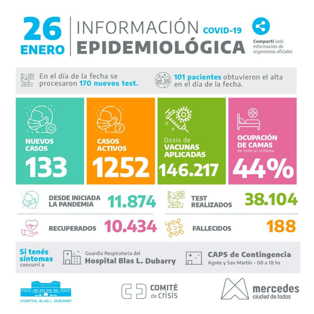 El informe epidemiológico brindado por las autoridades sanitarias de Mercedes comunicaron que entre 170 análisis procesados en el día de hoy 133 resultaron positivos. Asimismo, 101 pacientes fueron dados de alta médica este miércoles. Es así que son 1252 los pacientes que están transitando por la enfermedad covid-19