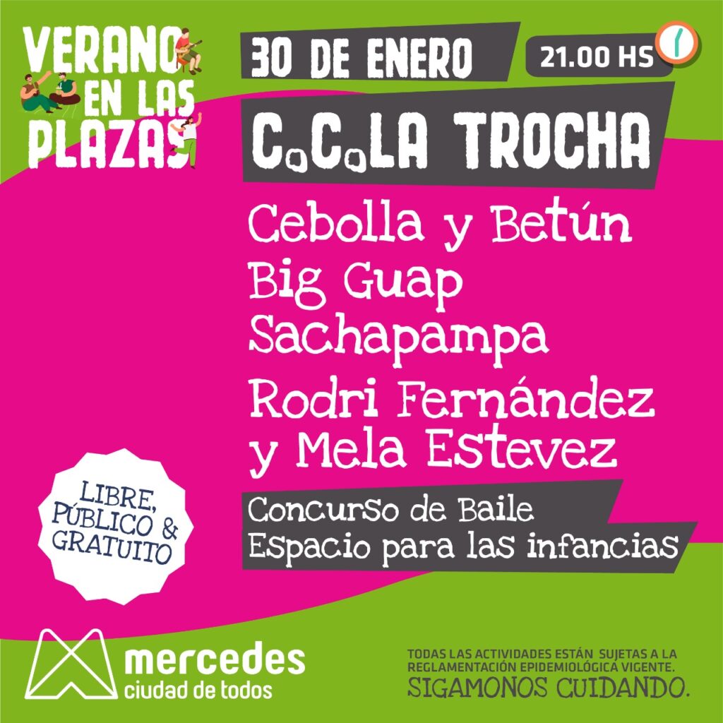 El ciclo “Verano en las plazas” continúa el domingo 30 de enero en el Centro Cultural La Trocha. A partir de las 21:00 horas, con la participación de Cebolla y Betún, Big Guap, Sachapampa y el cierre de la mano de Rodri Fernández y Mela Estevez.