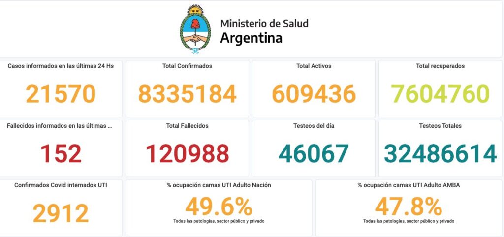 El Ministerio de Salud de la Nación informó este domingo que se registraron 21.570 nuevos contagios de coronavirus y 152 muertes. Con estos datos, el total de casos positivos desde el inicio de la pandemia se elevó a 8.335.184, mientras que las víctimas fatales suman 120.988.
