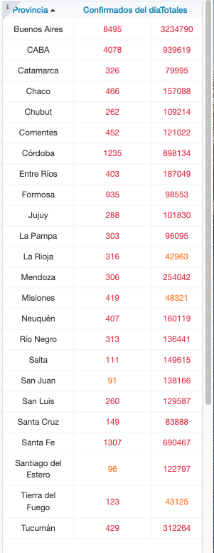 El total de acumulados por distrito indica para la provincia de Buenos Aires 3.234.790 casos; la Ciudad de Buenos Aires, 939.619; Catamarca, 79.995; Chaco, 157.088; Chubut, 109.214; Corrientes, 121.022; Córdoba, 898.134; Entre Ríos, 187.049; Formosa, 98.553; Jujuy, 101.830; La Pampa, 96.095; La Rioja, 42.963; Mendoza, 254.042; Misiones, 48.321; Neuquén, 160.119; Río Negro, 136.441; Salta, 149.615; San Juan, 138.166; San Luis, 129.587; Santa Cruz, 83.888; Santa Fe, 690.467; Santiago del Estero, 122.797; Tierra del Fuego, 43.125; y Tucumán, 312.264.