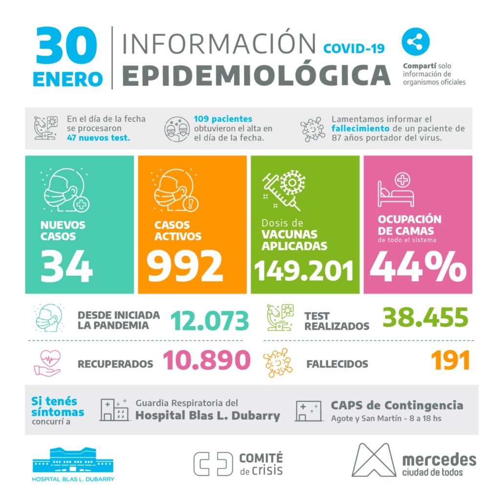 La información oficial brindada por las autoridades sanitarias de Mercedes confirma el fallecimiento de un paciente portador del virus. Asimismo, informan que entre los 47 análisis procesados en el día de la fecha, 34 resultaron positivos.