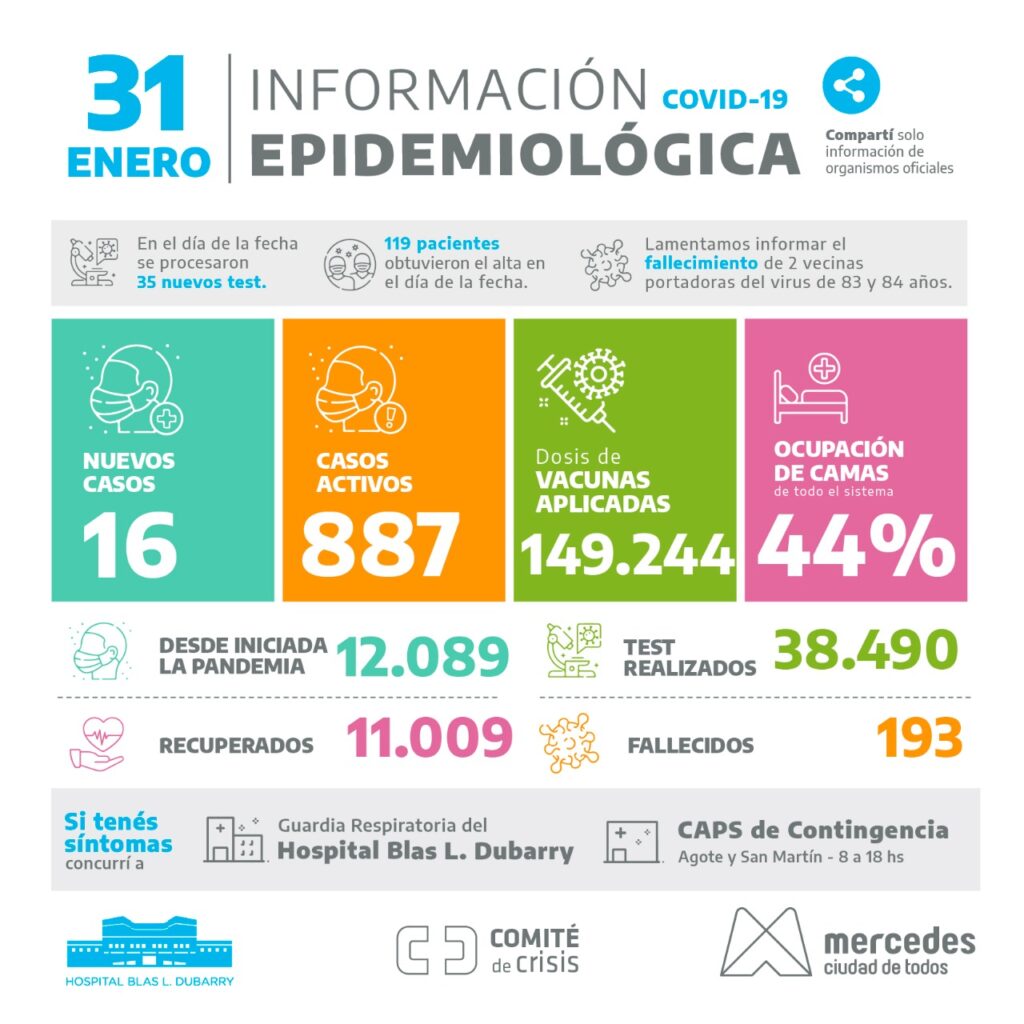Asimismo, la información oficial expresa que, a raíz de los nuevos criterios de hisopados dispuestos por las autoridades provinciales, el Laboratorio de Virología del Dubarry procesó 35 test este lunes, de los cuales 16 resultaron positivo. Es así que contabilizan 887 casos activos con una ocupación de cama del 44% en el sistema sanitaria local.