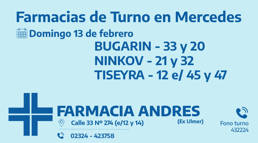 Desde las 8:30 del día de hoy hasta la misma hora de mañana, las farmacias de turno en Mercedes son: Bugarín, Ninkov y Tiseyra.