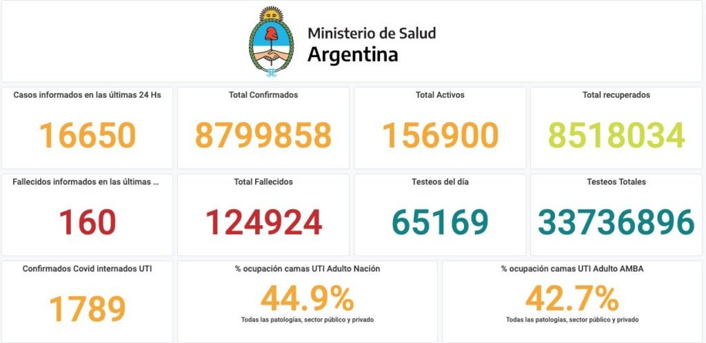 El Ministerio de Salud de la Nación informó este jueves que son 160 los fallecimientos por el virus, mientras que 16.650 fueron reportadas con coronavirus en las últimas 24 horas y 1.789 son las personas internadas con Covid en unidades de terapia intensiva.