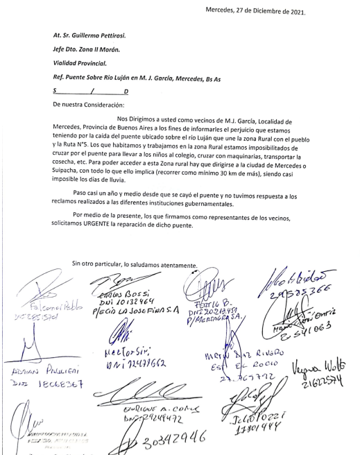A través de una carta enviaa al jefe zonal de Vialidad Provincial, los vecinos de M.J. García reiteran su reclamo y solicitud «urgente» del arreglo del puente de la zona rural que pasa sobre el Río Luján. Hablan de «perjuicio» que tienen ante la caída del puente, ya que están «imposibilitados de cruzar por el puente para llevar a los niños al colegio, cruzar con maquinarias, transportar la cosecha, etc».