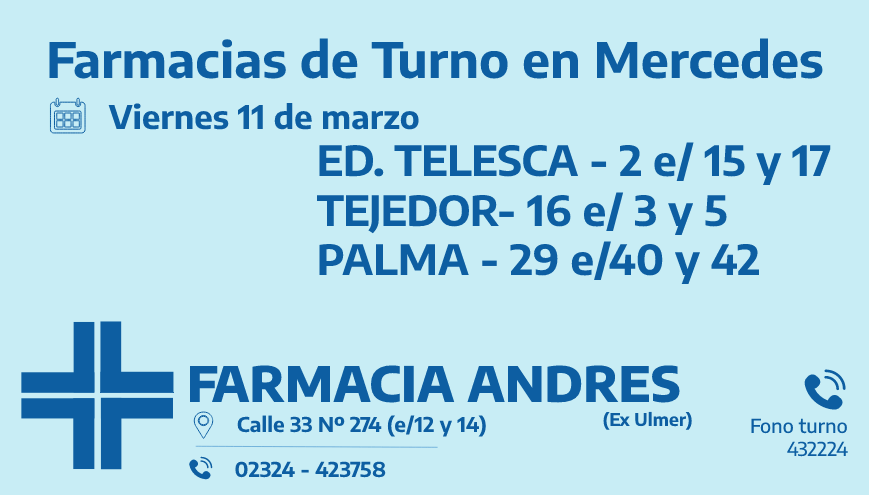 Desde las 8:30 del día de hoy hasta la misma hora de mañana, las farmacias de turno en Mercedes son: Eduardo Telesca, Tejedor y Palma.