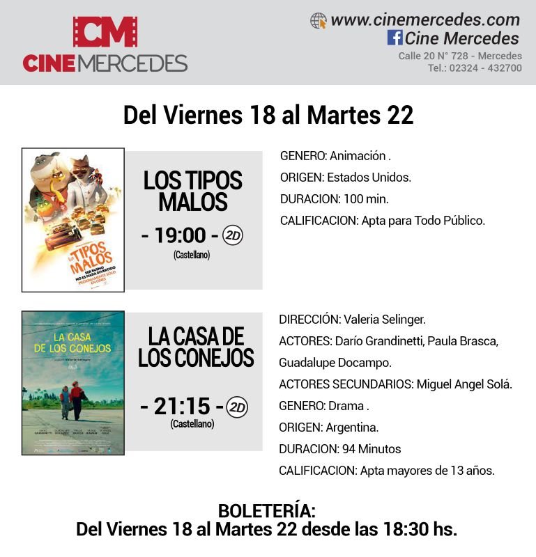 Desde el viernes 18 al martes 22 de marzo, el Cine Mercedes proyectará dos películas. La primera, apta todo público, es el film de animación «Los Tipos Malos» podrá verse en las funciones de la hora 19. En tanto, en las funciones de las 21:15, se presenta la película argentina «La Casa de los Conejos».