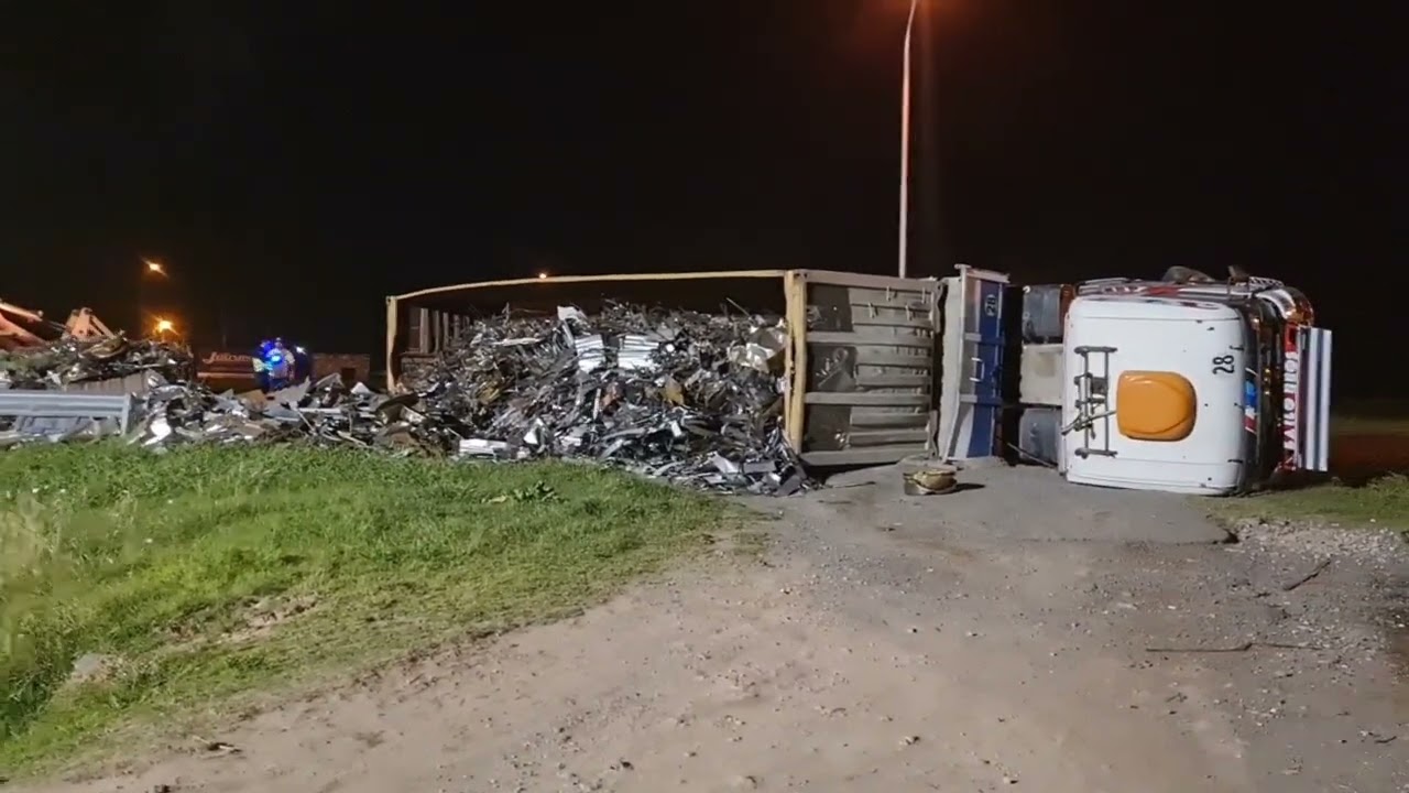 Un espectacular vuelco de un camión se produjo en la rotonda de ruta nacional nº5 en el acceso a Mercedes. Se desconocen los motivos del vuelco, pero a priori se notó que trasladaba una carga pesada. El conductor salió ileso, siendo una excelente noticia.