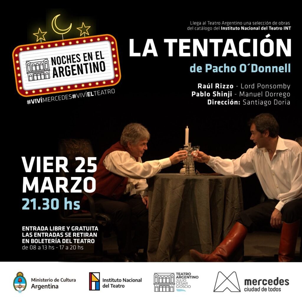 El Municipio de Mercedes, a través de la Dirección de Cultura, el Ministerio de Cultura y el Instituto Nacional de Teatro, llevará adelante el ciclo “Noches en el Argentino”. Este viernes 25 de marzo, 21:30 horas, se presentará la obra “La Tentación” de Pacho O´Donnell. Obra que protagoniza Raúl Risso y Pablo Shinji, con la dirección de Santiago Doria. Las entradas son libres y gratuitas. Se retiran en la boletería del teatro en los horarios de 8 a 13 y de 17 a 20 horas.