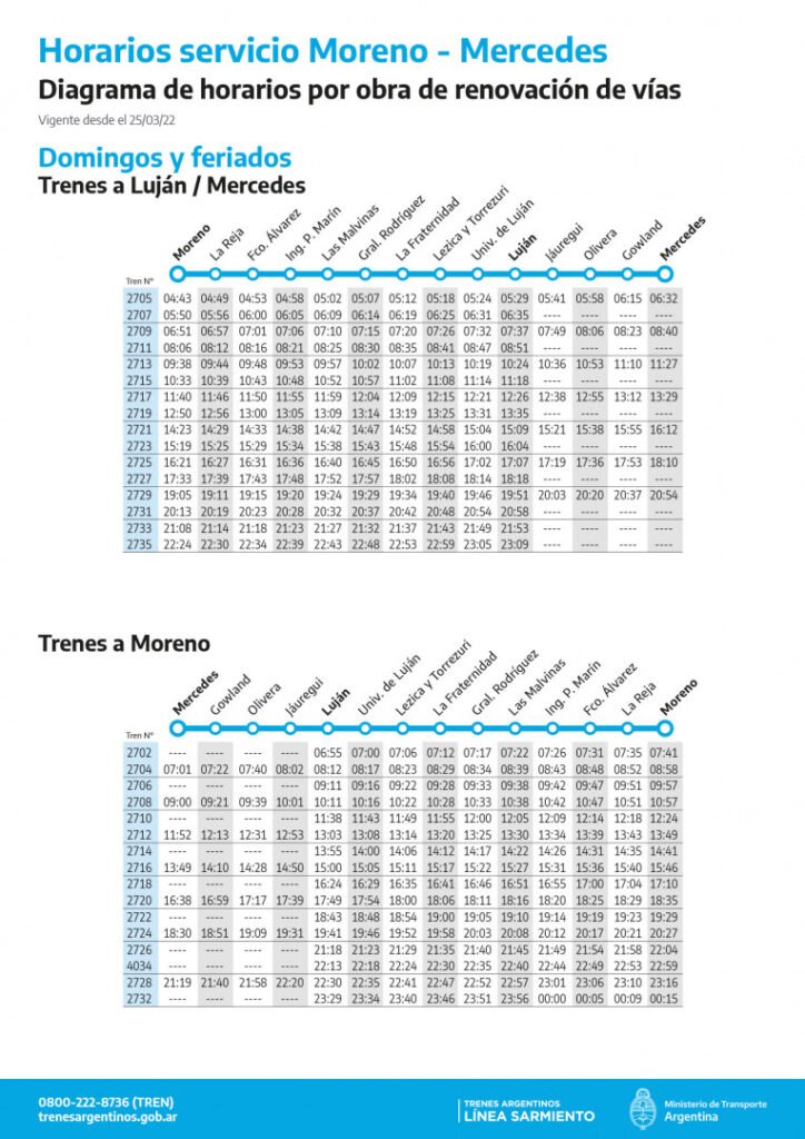 Trenes Argentinos anunció que desde este viernes 25 de marzo cambia el cronograma de horarios del Tren Sarmiento. El ramal que une Mercedes con Moreno diagramó sus nuevos horarios de acuerdo a las obras que están llevando a cabo con la renovación de vías.