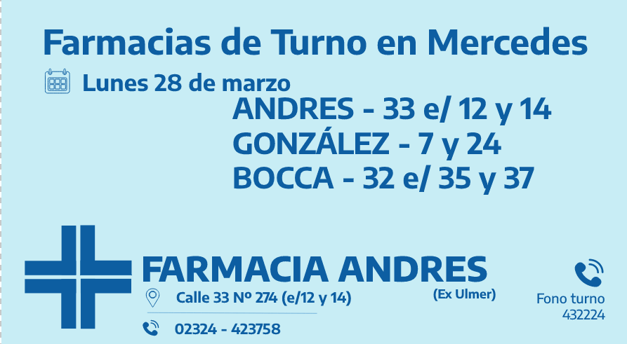 Desde las 8:30 del día de hoy hasta la misma hora de mañana, las farmacias de turno en Mercedes son: Andrés, González y Bocca.