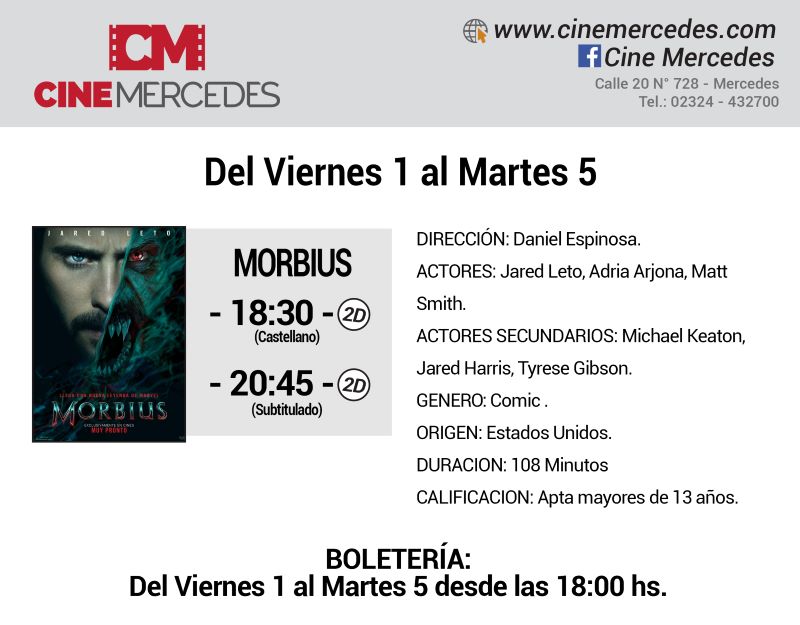 Este viernes 1° de abril, la pantalla del Cine Mercedes tendrá el estreno de Morbius. En las funciones de 18:30 y 20:45 horas, podrá verse a Jared Leto en el papel de uno de los villanos más icónicos del universo de Spider Man y Marvel.