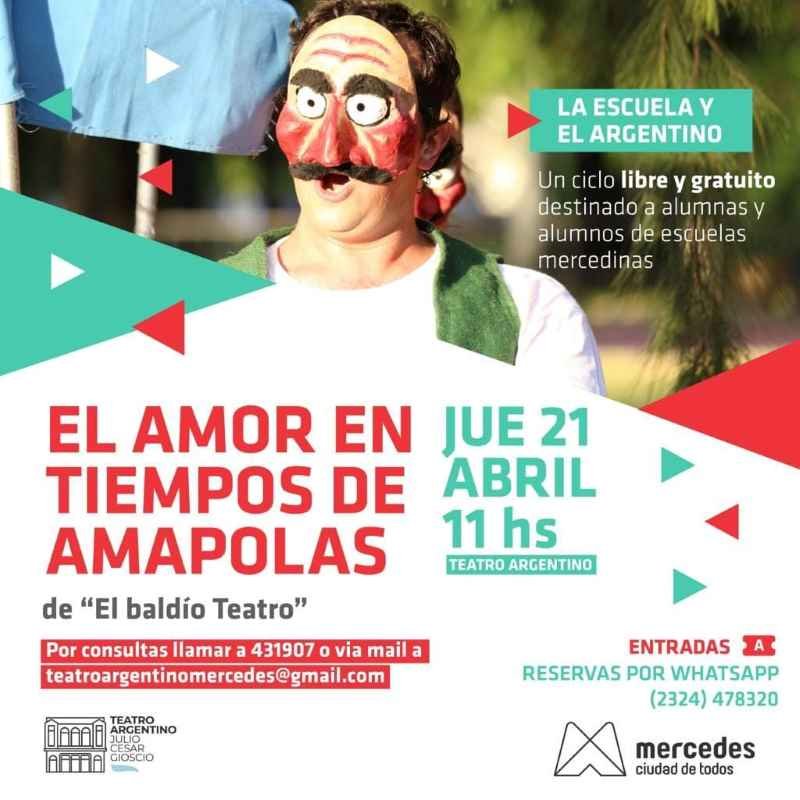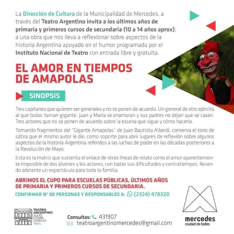 Desde el área de Cultura y Educación de la Municipalidad invitan a los 6º años de las instituciones educativas y 1º ciclo de secundarias a reservar su lugar para compartir “El amor en tiempos de amapolas”, una excelente obra gestionada ente el Instituto Nacional del Teatro.