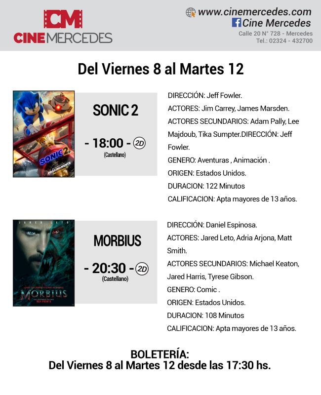 El Cine Mercedes tendrá en su pantalla dos películas. Continúa en cartelera el film de Marvel, Morbius, y se estrena la segunda parte de Sonic. La película animada puede verse en las funciones de la hora 18, mientras que la del villano de comics a las 20:30. Las películas se presentan desde el viernes 8 al martes 12 de abril.