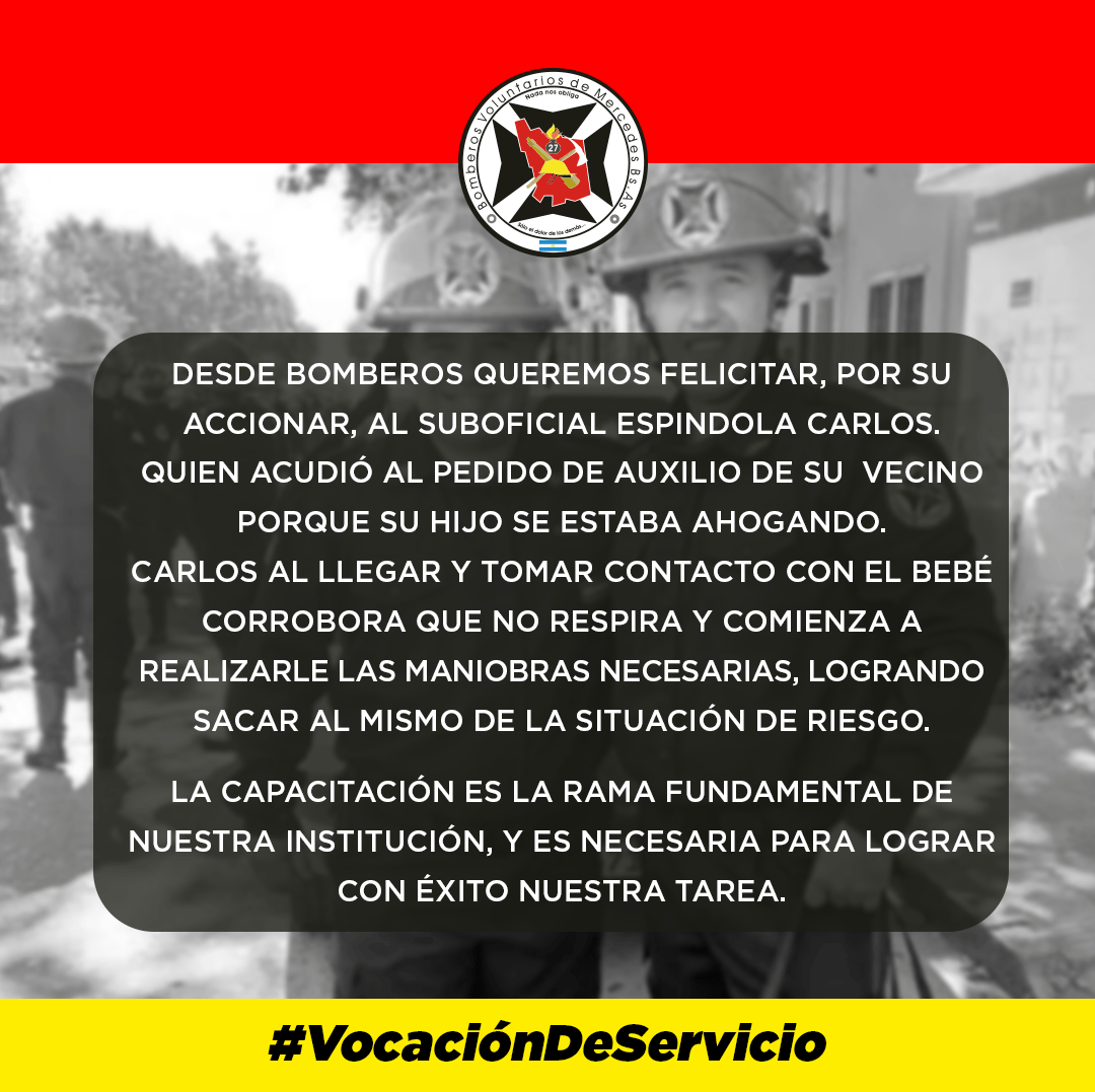 Desde el cuerpo de Bomberos Voluntarios de Mercedes informaron que el Suboficial Carlos Espíndola, integrante activo de la institución, actuó ante un pedido de auxilio de un vecino ante la situación que estaba viviendo un pequeño del barrio.