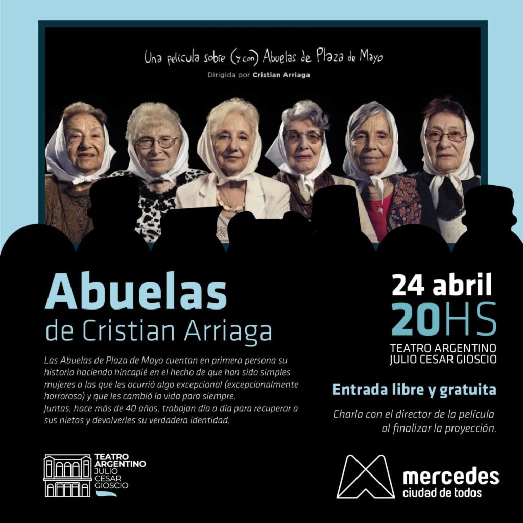 Este domingo 24 de abril se presentará en nuestra ciudad el Film Abuelas Una película sobre (y con) Abuelas de Plaza de Mayo que se realizó en conmemoración y reconocimiento de los 45 años de lucha de la Abuelas de Plaza de Mayo. La proyección será en la sala B del Teatro Argentino “Julio César Gioscio”, a las 20:00 , y la entrada es libre y gratuita. Además, luego de la misma, su director Cristian Arriaga estará realizando una charla/debate.