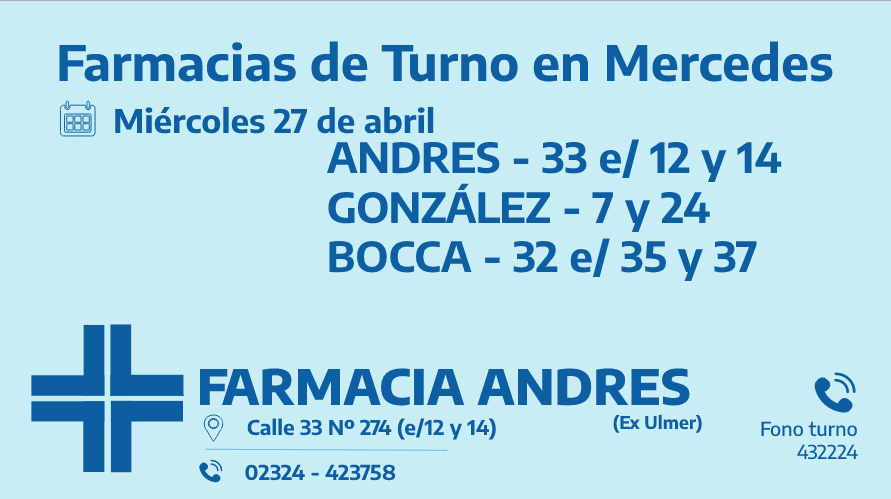 Desde las 8:30 del día de hoy hasta la misma hora de mañana, las farmacias de turno en Mercedes son: Andrés, González y Bocca
