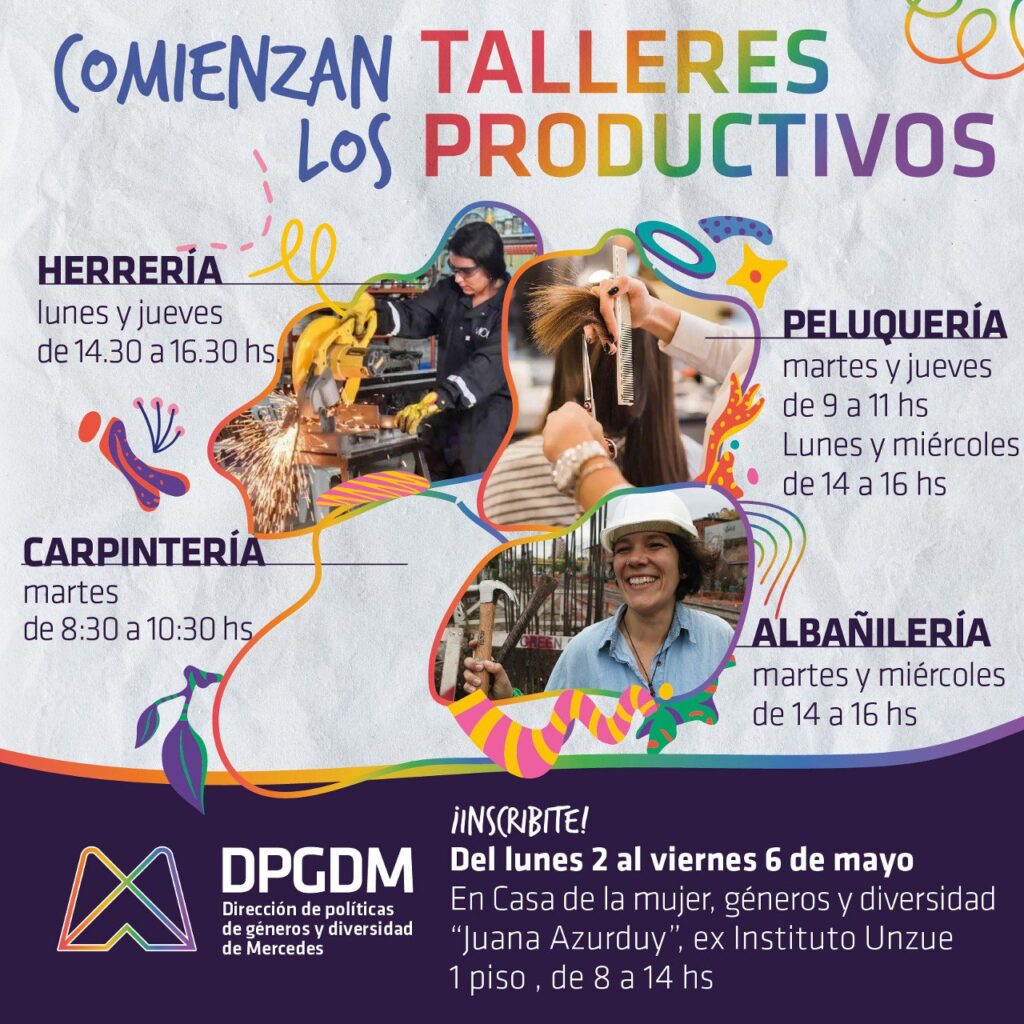 Desde la Dirección de políticas de géneros y diversidad se lanzó la inscripción a los Talleres Productivos para mujeres. El mismo comenzó el lunes 2 de mayo y estará abierta hasta este viernes 6, en la Casa de la Mujer, géneros y diversidad “Juana Azurduy”, ex instituto Unzué, primer piso, de 8:00 a 14:00 horas.
