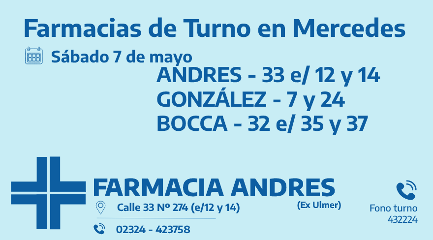 Farmacias de turno del sábado 7 de mayo 7 mayo, 2022Desde las 8:30 del día de hoy hasta la misma de mañana, las farmacias de turno en Mercedes son: Andrés, González y Bocca.Comparte esto: Haz clic para compartir en WhatsApp (Se abre en una ventana nueva) WhatsApp Haz clic para compartir en Telegram (Se abre en una ventana nueva) Telegram Haz clic para compartir en X (Se abre en una ventana nueva) X Haz clic para compartir en Facebook (Se abre en una ventana nueva) Facebook TE PUEDE INTERESARCOMENTARIOS Comentarios