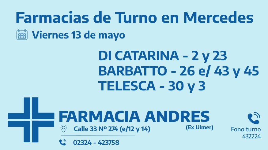 Desde las 8:30 del día de hoy hasta la misma hora de mañana, las farmacias de turno en Mercedes son: Di Catarina, Barbatto y Telesca.