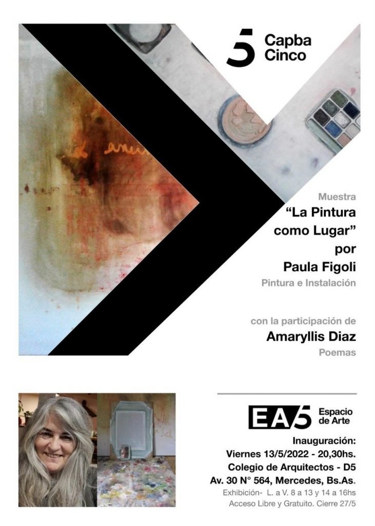 Este viernes 13 de mayo, 20:30 hs, se realizará en la Sede Distrital del Colegio de Arquitectos de la provincia de Bs As Distrito 5, (Av. 30 Nª 564, Mercedes); la muestra colectiva de dibujo y pintura integrada por las artistas Paula Figoli -pintura e instalación- y Amaryllis Díaz -poemas-. El título de la muestra es “La Pintura como lugar”.