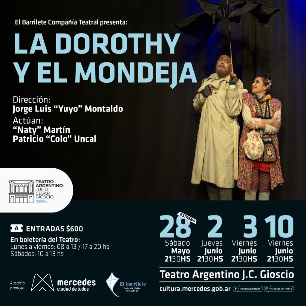 La compañía de teatro independiente mercedino «El Barrilete» estrena la obra «La Dorothy y el Mondeja». De autor uruguayo, la propuesta teatral sube al escenario a Naty Martín y a Patricio «Colo» Uncal, ambos con la dirección de Jorge «Yuyo» Montaldo. El estreno de la obra será el 28 de mayo, las entradas están a la venta a 600 pesos. La puesta en escena del elenco local continuará los días 2, 3 y 10 de junio.