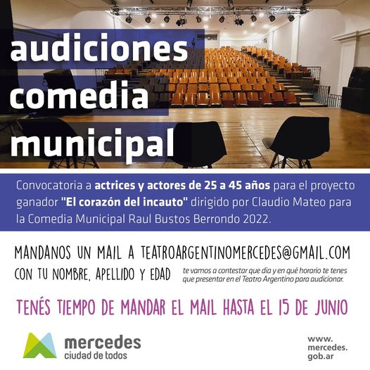 Se encuentra abierta la convocatoria para para concretar las audiciones que elegirán a los actores y actrices de la obra «El Corazón del Incauto» que dirigirá Claudio Mateo para la Comedia Municipal «Raúl Bustos Berrondo» 2022. La convocatoria es para actrices y actores de 25 a 45 años. Los interesados deben mandar un correo electrónico al teatroargentinomercedes@gmail.com Hasta el 15 de junio se recibirán los mail con los datos de los interesados. La respuesta que recibirán será con el día y la hora que deberán presentarse a la audición.