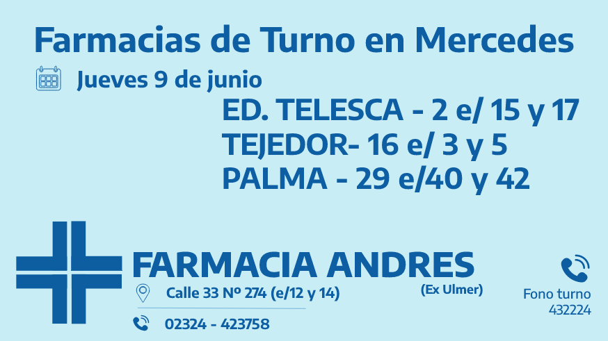 Desde las 8:30 del día de hoy hasta la misma hora de mañana, las farmacias de turno en Mercedes son: Eduardo Telesca, Tejedor y Palma.