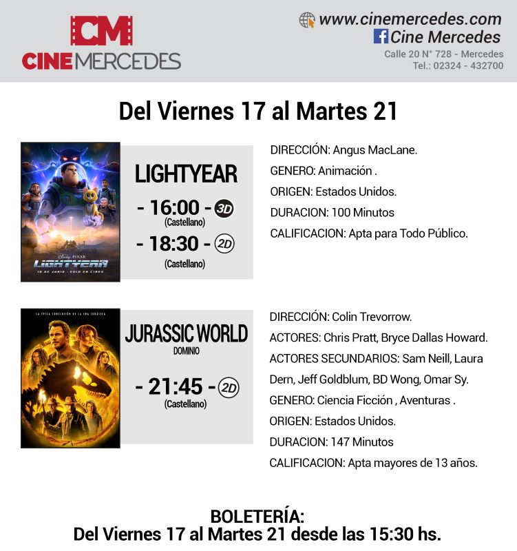 Desde el viernes 17 hasta el martes 21 de junio, el Cine Mercedes estará proyectando en estreno la película que cuenta la historia de Buzz Lightyear, uno de los juguetes principales de la saga Toy Story. Las funciones serán a la hora 16 (3D – castellano) y a 18:30 horas (2D – castellano). También, continúa Jurassic World en las funciones de 21:45 horas.