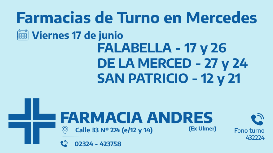 Desde las 8:30 del día hoy hasta la misma hora de mañana, las farmacias de turno en Mercedes son: Falabella, De la Merced y San Patricio.