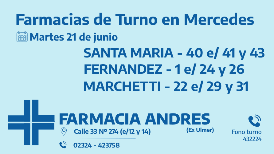 Desde las 8:30 del día de hoy hasta la misma hora de mañana, las farmacias de turno en Mercedes son: Santa María, Fernández y Marchetti.