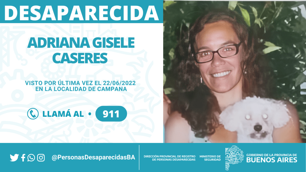 La Dirección Provincial de Registro de Personas Desaparecidas de la provincia de Buenos Aires hace una llamado a la solidaridad provincia ante la búsqueda de Adriana Gisele Caseres que fue vista por última vez el 22 de junio pasado en la localidad de Campana.