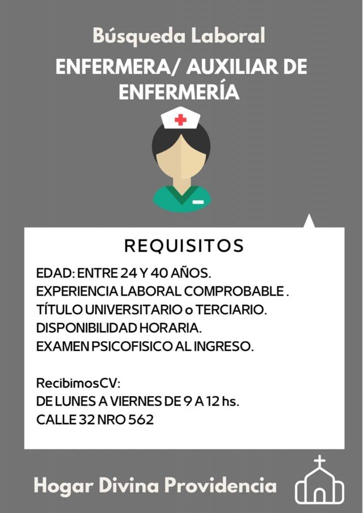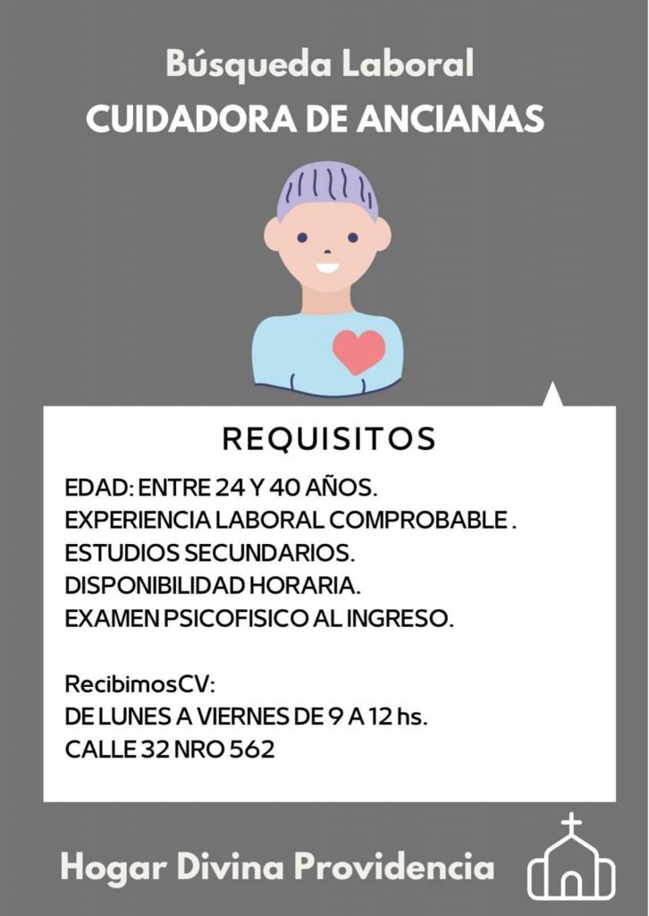 A pedido del Hogar Divina Providencia se difunde las búsquedas que desde allí están realizando. La institución está buscando enfermeras, auxiliar de enfermería y cuidadores para adultas mayores.