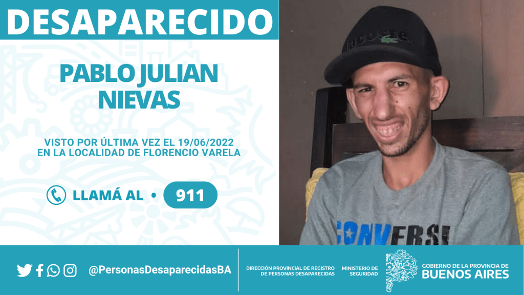 La Dirección Provincial de Registro de Personas Desaparecidas de la provincia de Buenos Aires solicita la solidaridad de los bonaerense con la búsqueda de una persona. Se trata de Pablo Julián Nievas visto por última vez el 19 de junio en Florencio Varela.