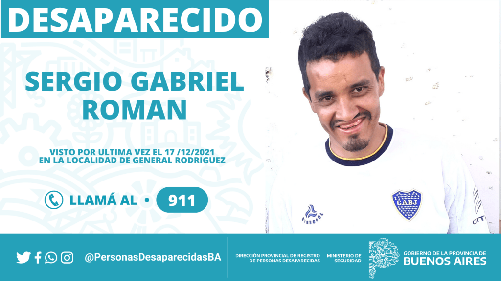A más de seis meses de su desaparición, la Dirección Provincial de Registro de Personas Desaparecidas está en la búsqueda de Sergio Gabriel Román, de 34 años, que fue visto por última vez el 17 de diciembre de 2021 en General Rodríguez.