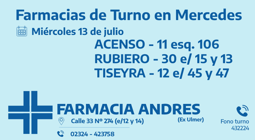 Desde las 8 30 del día de hoy hasta la misma hora de mañana las farmacias de turno en Mercedes son: Acenso, Rubiero y Tiseyra.