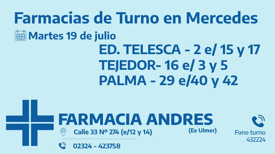 Desde las 8:30 del día de hoy hasta la misma hora de mañana, las farmacias de turno en Mercedes son: Eduardo Telesca, Tejedor y Palma.
