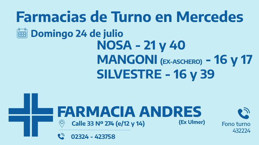 Desde las 8 30 del día de hoy hasta la misma hora de mañana las farmacias de turno en Mercedes son: Nosa, Mangoni y Silvestre.