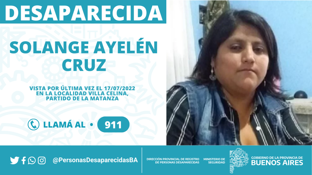 Desde la Dirección Provincial de Registro de Personas Desaparecidas, buscan el paradero de Solange Ayelén Cruz de 28 años. Solange fue vista por última vez el 17 de julio de 2022 en la ciudad de Villa Celina, partido de La Matanza, provincia de Buenos Aires.