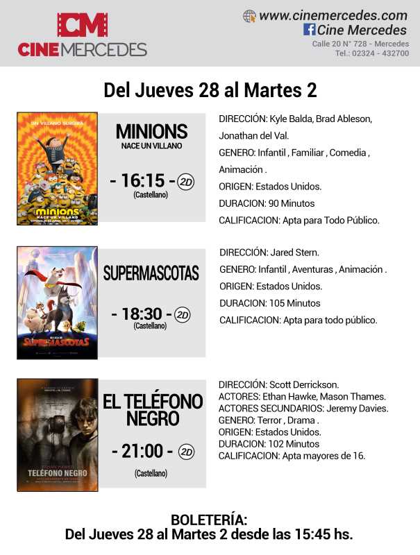 El Cine Mercedes estará proyectando tres películas entre el jueves 28 de julio y el martes 2 de agosto. Continúa «Minions: Nace un Villano» y se suman «Supermascotas» en los últimos días de las vacaciones de invierno. El terror llega de la mano «El Teléfono Negro».