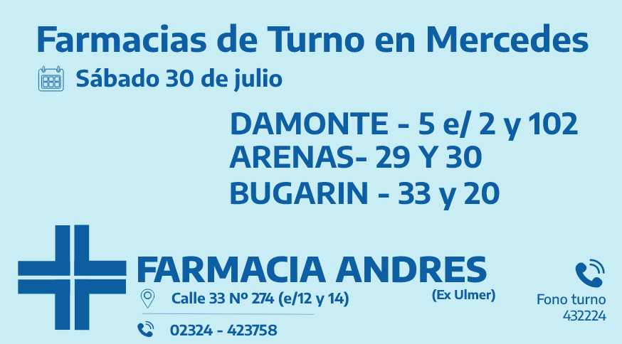 Desde las 8 30 del día de hoy hasta la misma hora de mañana las farmacias de turno en Mercedes son: Damonte, Arenas y Bugarin.