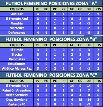 • Zona A: 1° AMEFIP San Martín 9 puntos, 2° El Frontón Azul 7, 3° Flandria 4 unidades, 4° Defensores y Mercedes 3.