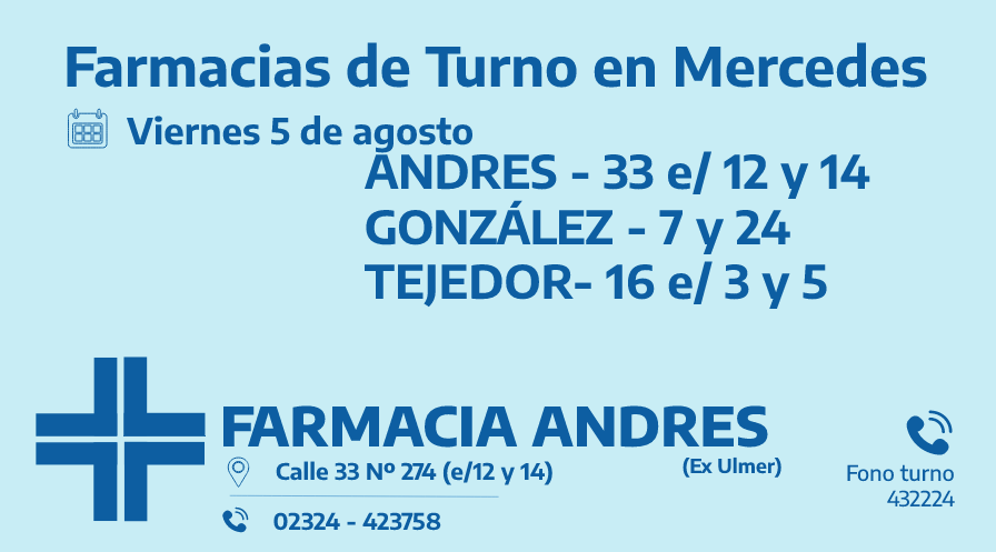 Desde las 8:30 del día de hoy hasta la misma hora de mañana, las farmacias de turno en Mercedes son: Andrés, González y Tejedor.